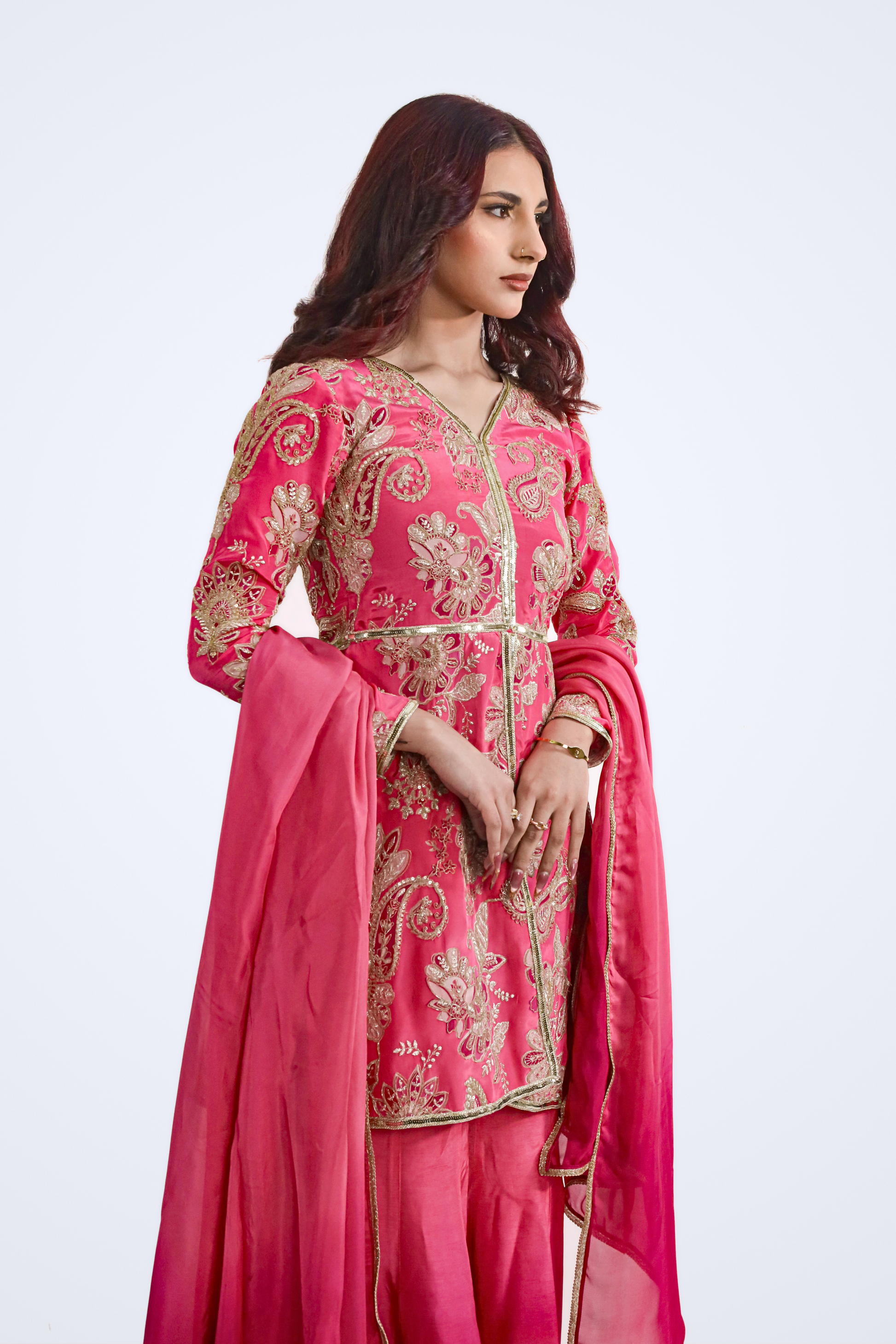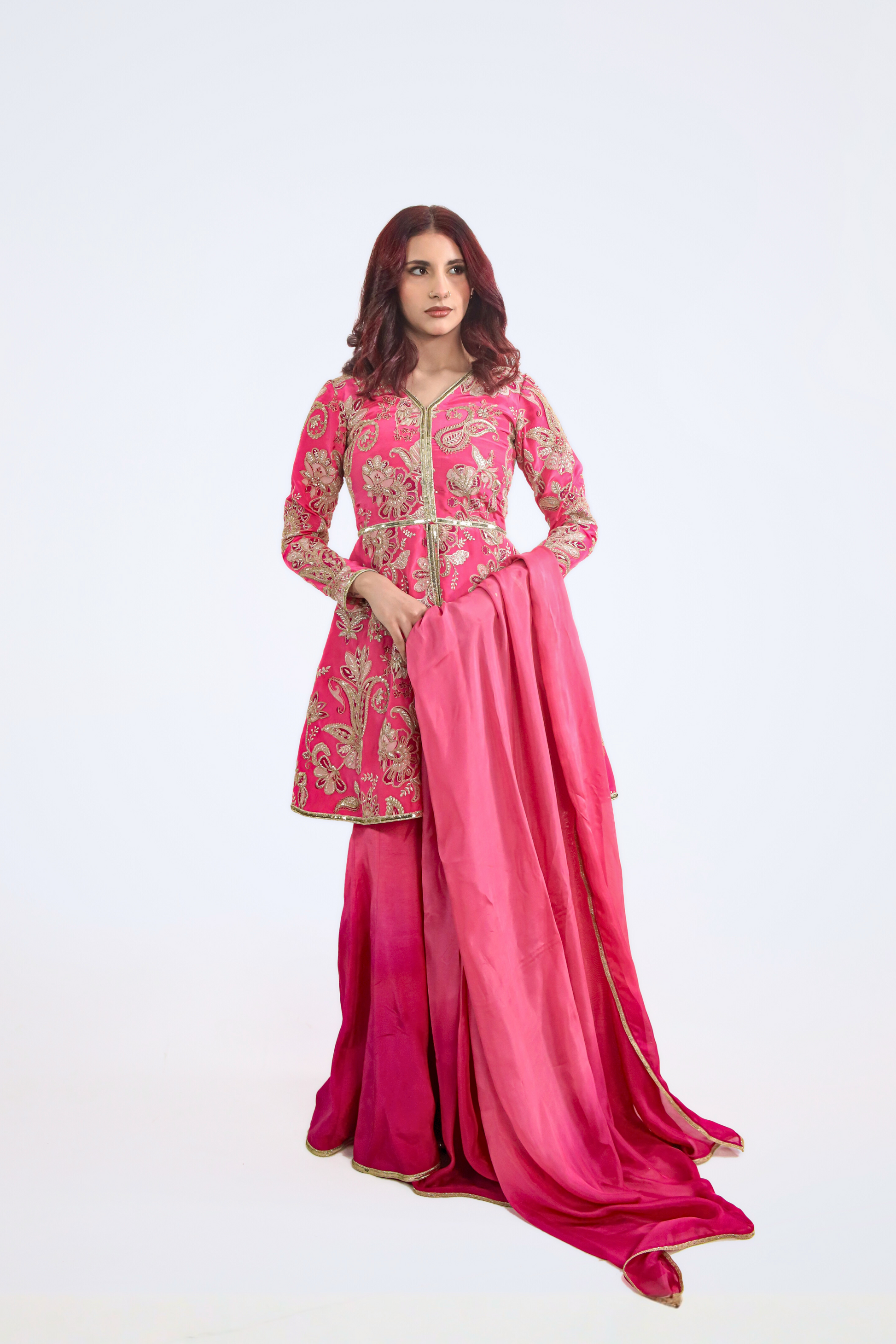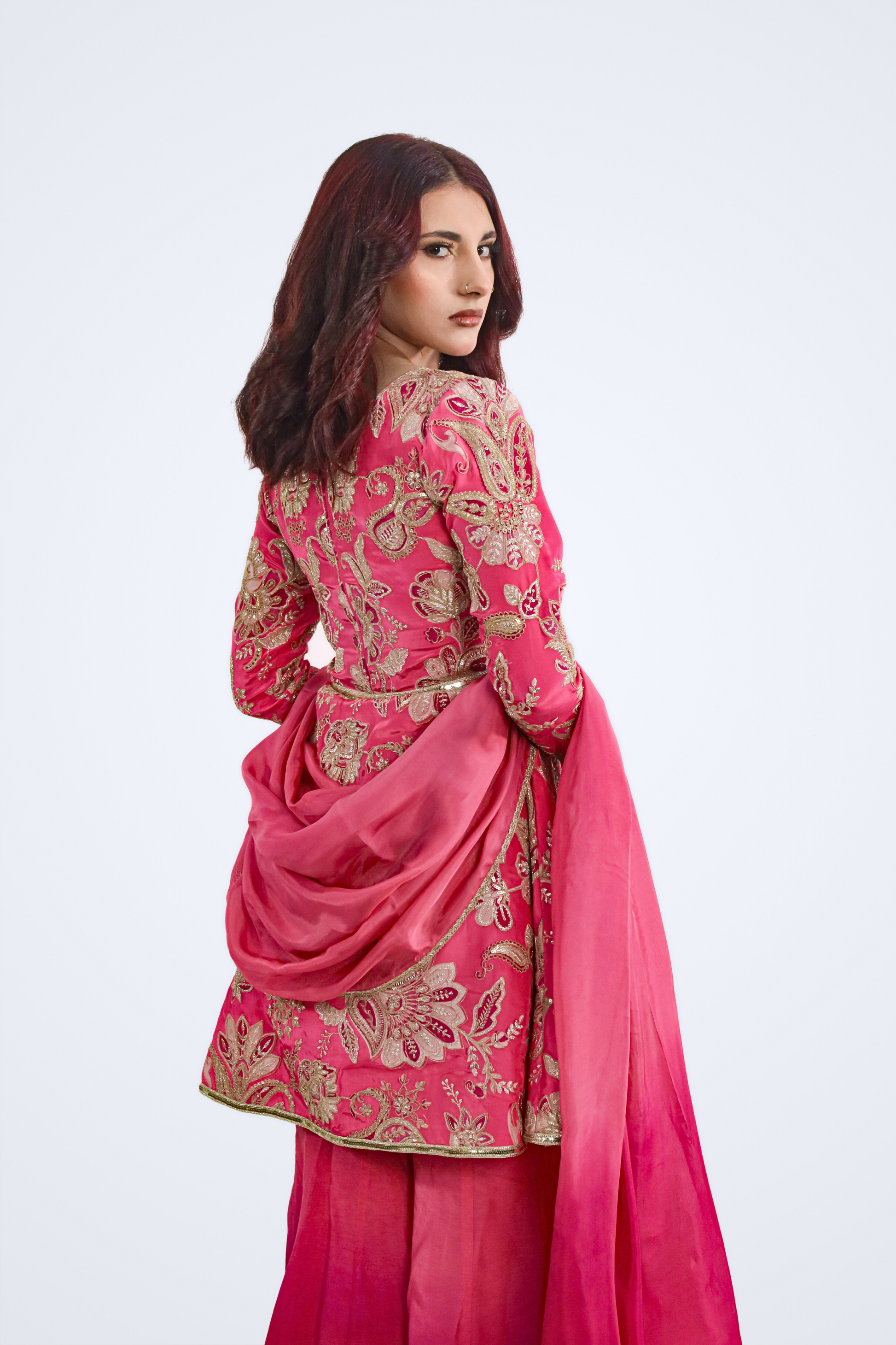 Paired with pink ombré paneled sharara pants that flow beautifully with movement, the outfit is completed with a matching pink silk dupatta finished with elegant gold trim for a cohesive and elevated touch.